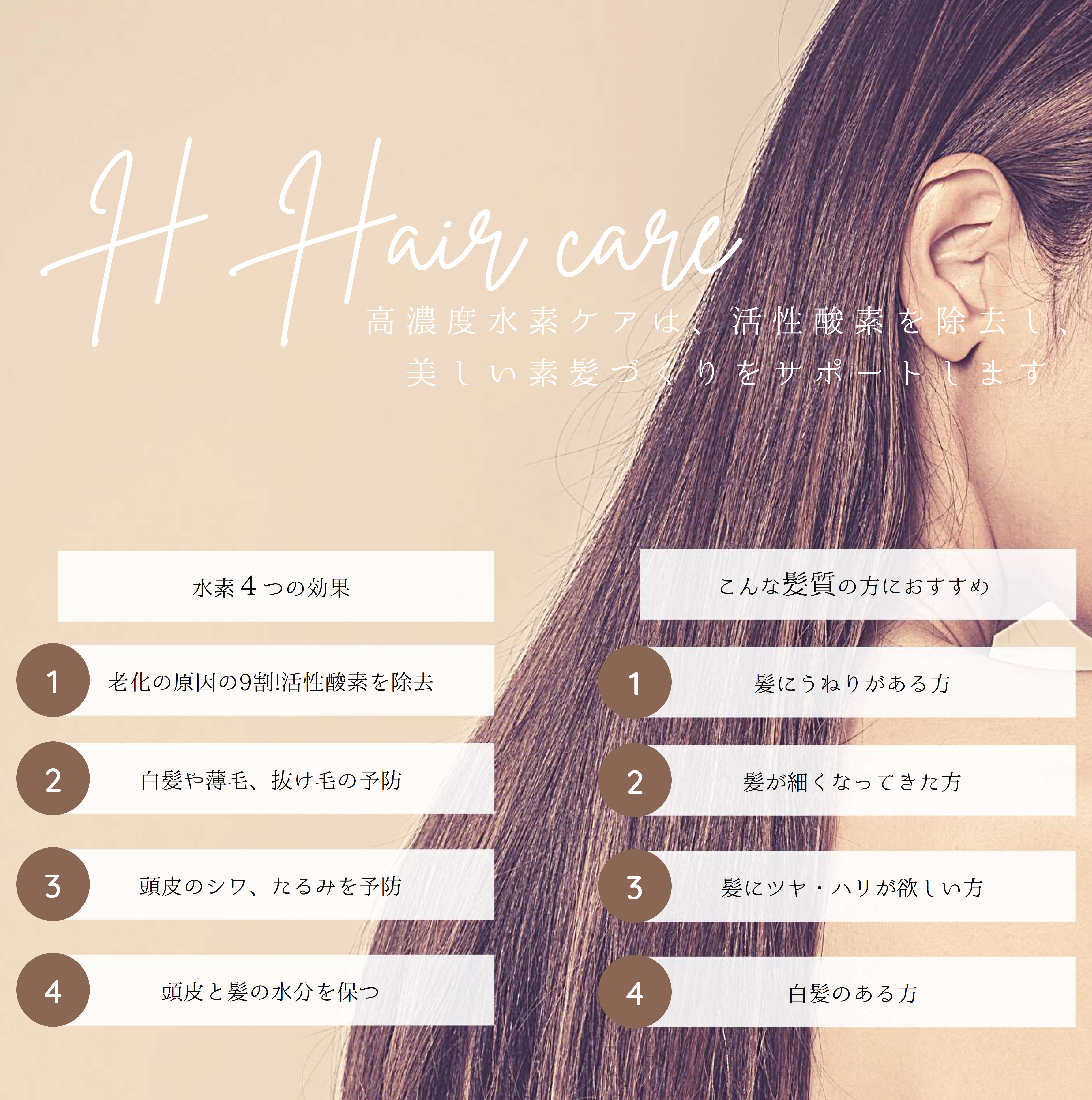 水素×結合水のケアは、スキンケア=素髪を美しくするケア だとイメージいただくといいかもしれません。